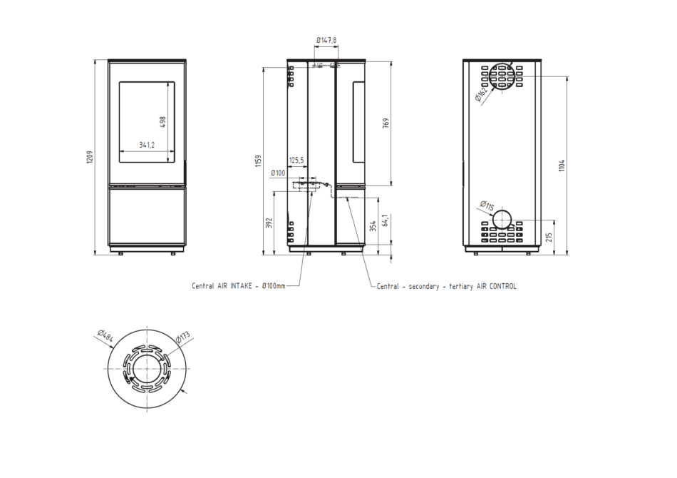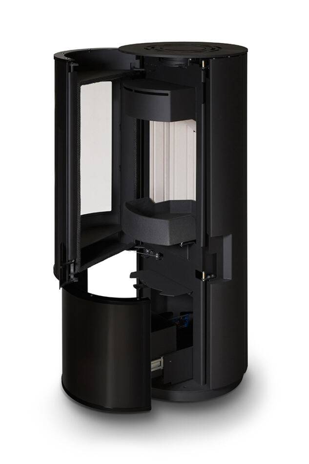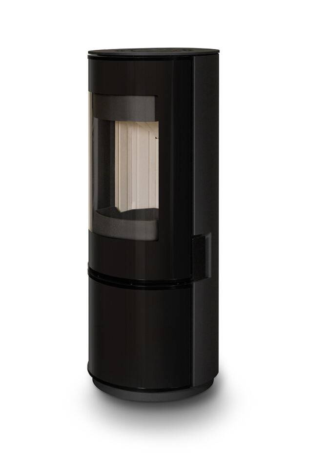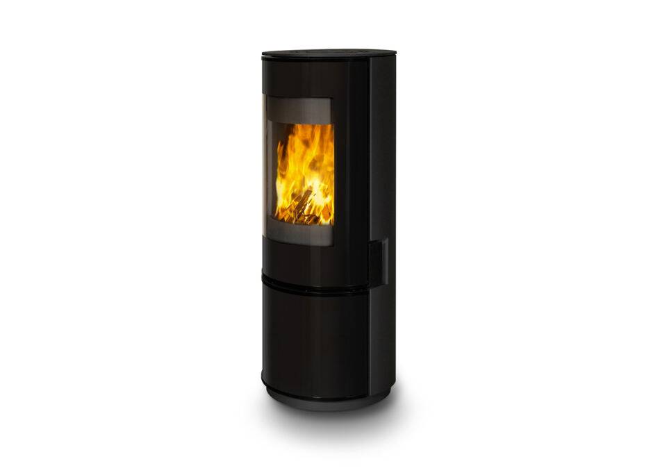 Le poêle à bois Carina de Ambifire est élégant et compact, avec un plan circulaire et une façade en verre distinctive. Son design et ses fonctionnalités sont soulignés par une porte de tiroir coulissante avec verre noir intégré, une poignée intégrée cachée ou un système de porte à fermeture automatique.